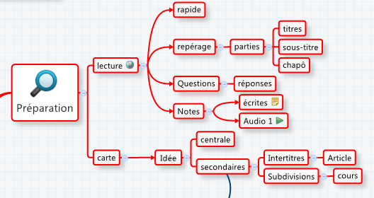 Au cours de cette première lecture, prenez quelques notes. Ces premières notes, vous pouvez les prendre sous forme d’une mindmap rudimentaire : idée centrale (le titre), idées secondaires (intertitres, chapô, rubriques). XMind vous permet aussi de prendre des notes écrites (plus longues que de simples mots-clés, déjà « rédigées ») et qui seront incluses dans un document exporté sous format texte si vous le souhaitez. J’y reviendrai. Et aussi des notes audio : vous enregistrez votre voix et la note apparaît (sous forme de flèche verte) dans le sujet et la branche choisie.