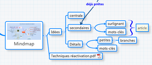 Vous pouvez repérer les mots importants en les surlignant dans l’article. XMind vous permet aussi d’intégrer dans vos sujets des documents (ici, un PDF, une mindmap sur les techniques de réactivation de la mémoire).
