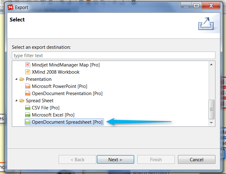 J’ai obtenu l’affichage du menu Exports vers OpenOffice Spreadsheet :