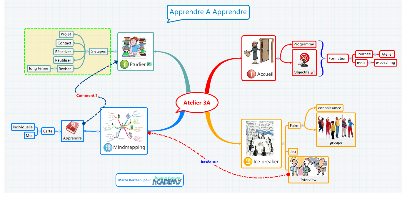 Ensuite, nous entrons dans le vif du sujet avec un petit jeu pour faire connaissance. Nous irons un peu plus loin dans cette connaissance mutuelle avec la technique de l’interview. Mais celle-ci se base sur une première utilisation du mindmapping. Je ne vous en dis pas plus, découvrez tout cela avec nous samedi 12, lors de cet atelier Apprendre A Apprendre !